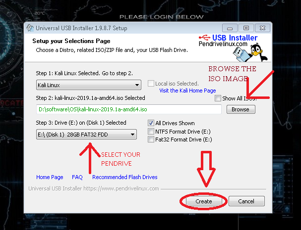 Open the Universal USB Installer and select Kali linux